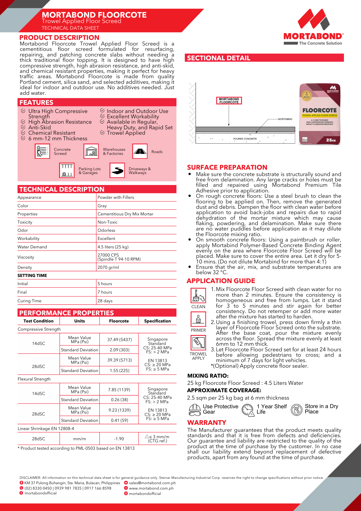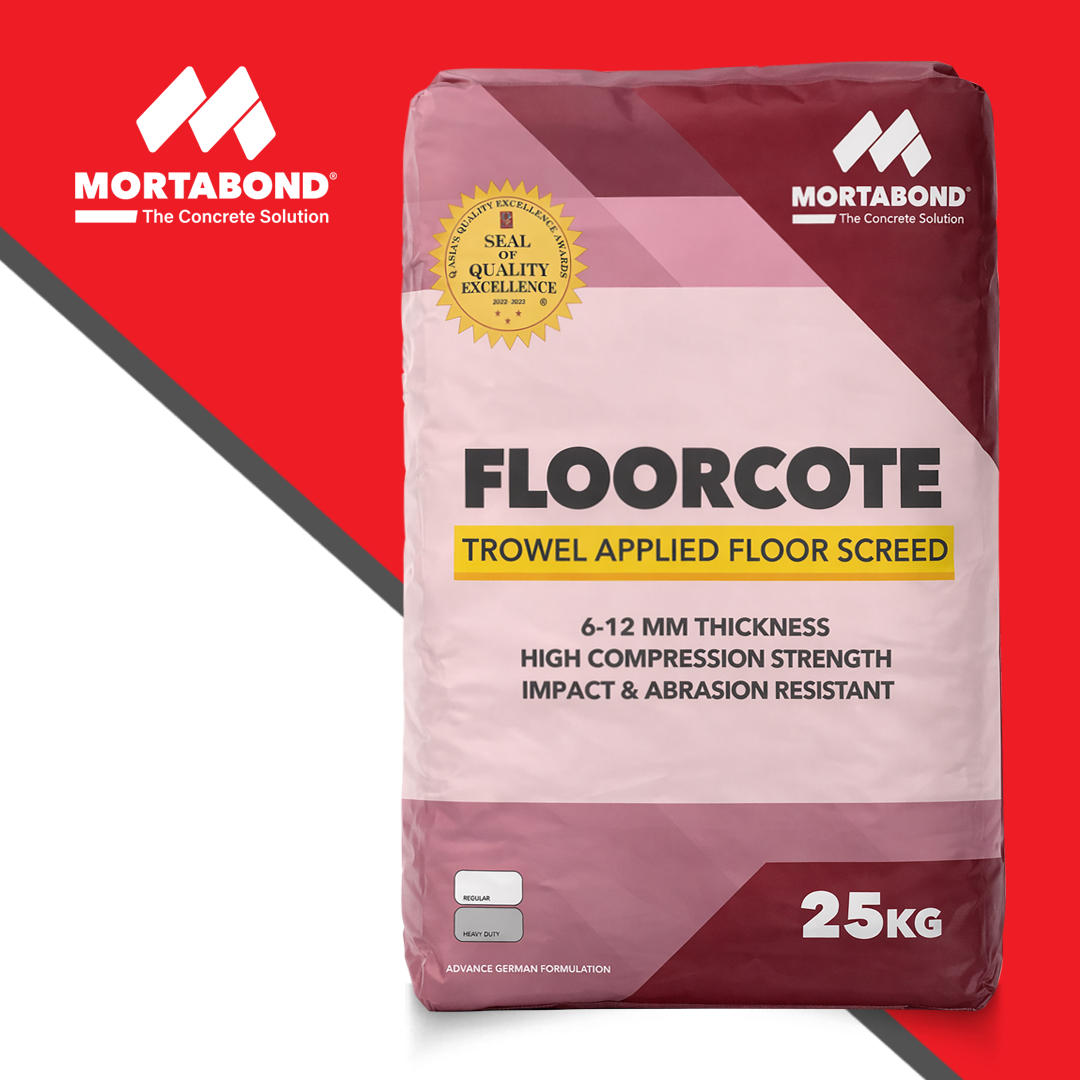 Floorcote Trowel Applied Floor Screed is a cementitious floor screed formulated for resurfacing, repairing, and patching concrete slabs without needing a thick traditional floor topping. It is designed to have high compressive strength, high abrasion resistance, and anti-skid, and chemical resistant properties, making it perfect for heavy traffic areas. Mortabond Floorcote is made from quality Portland cement, silica sand, and selected additives, making it ideal for indoor and outdoor use. No additives needed. Just add water.
